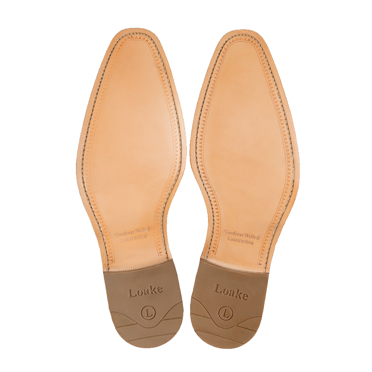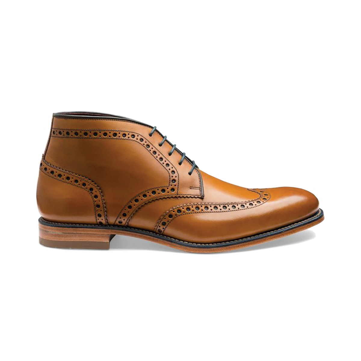 The Loake Errington stylish brogue ankle boot made from soft calf leather, featuring a contrast blue welt and a Goodyear welted leather sole, with a natural edge finish.